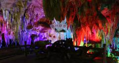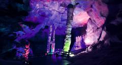 更絕的是,鵝管和鐘乳石倒映在水中,上下映照、渾然一體、形成了一座五光十色的巨大金山,光芒四射、龍鱗點(diǎn)點(diǎn)。她離奇多變的光影、五彩繽紛的顏色、千姿百態(tài)的形狀、加上水滴池面、洞中的天籟之音,形成了神秘之境讓你感到撲朔迷離,如在夢(mèng)中、疑似天堂。當(dāng)您走近她時(shí),就體會(huì)到什么是人間仙境,什么是滄海桑田;當(dāng)您聆聽她時(shí),就知道什么是余音繞梁,什么是仙樂飄飄。那感覺、那韻味豈是語(yǔ)言能描述出來的。