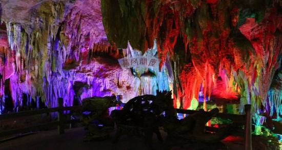 玉皇天宮由巨型石筍、石柱組成的寬敞高大的石廳。集水池、流石壩一體,高出地下河約28米,這里匯聚哪吒出世、玉皇天宮兩大世界溶洞自然景觀之絕。
